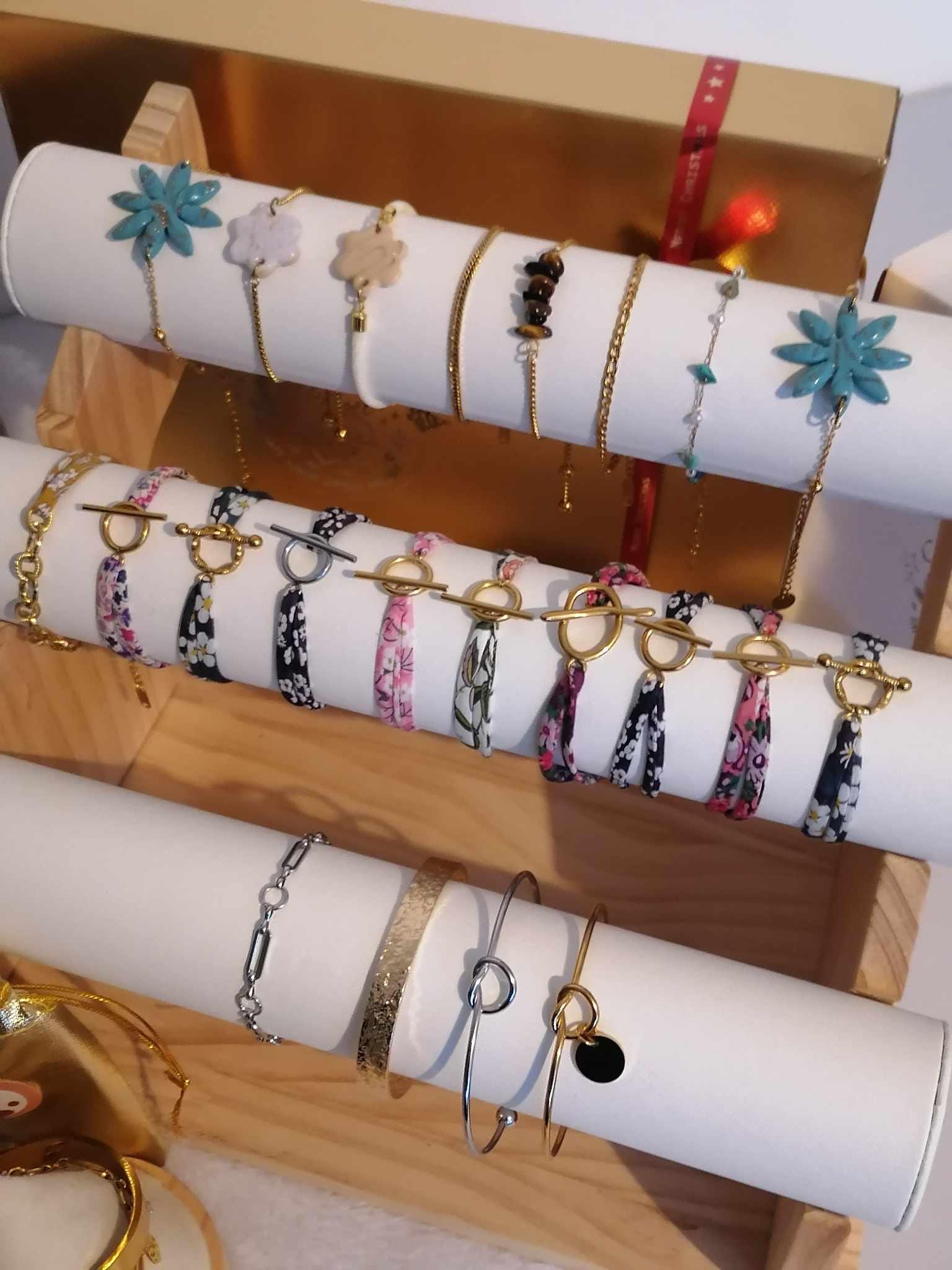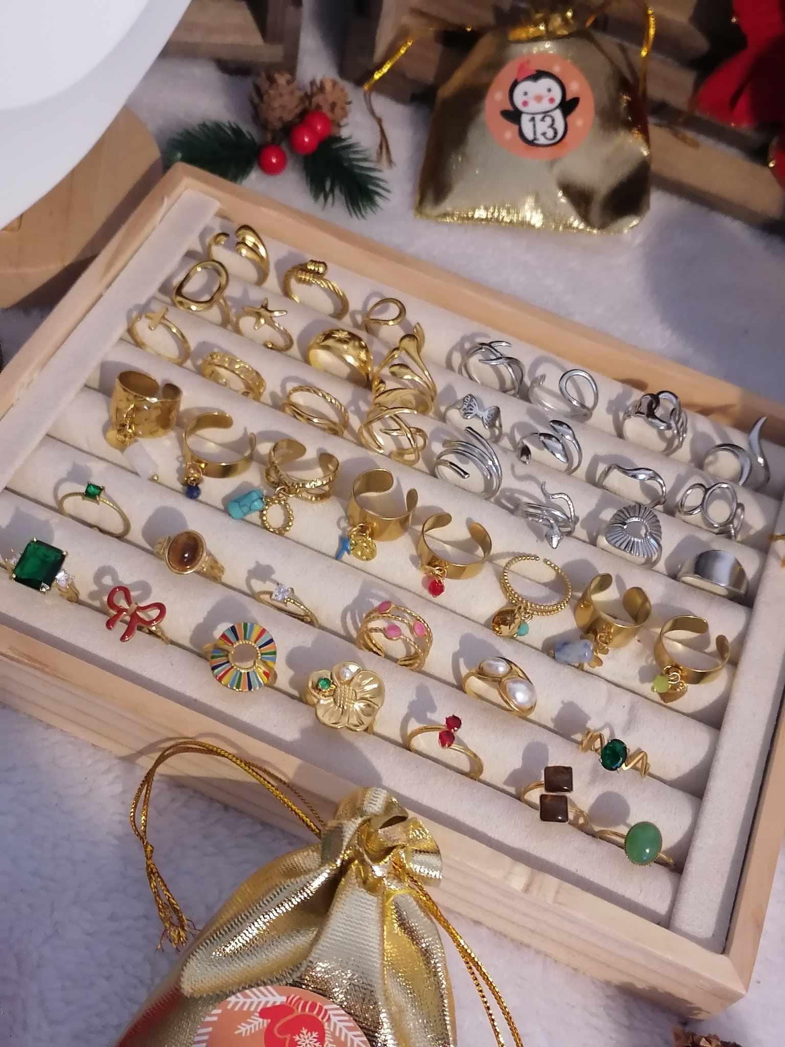 Calendar contents 12 boxes (approximate depending on the models) -5 pairs of interchangeable earrings and/or tassels -4 adjustable stainless steel rings (gold or silver) -2 bracelets (Liberty, bangle or chain depending on the models) -1 stainless steel necklace 🎁